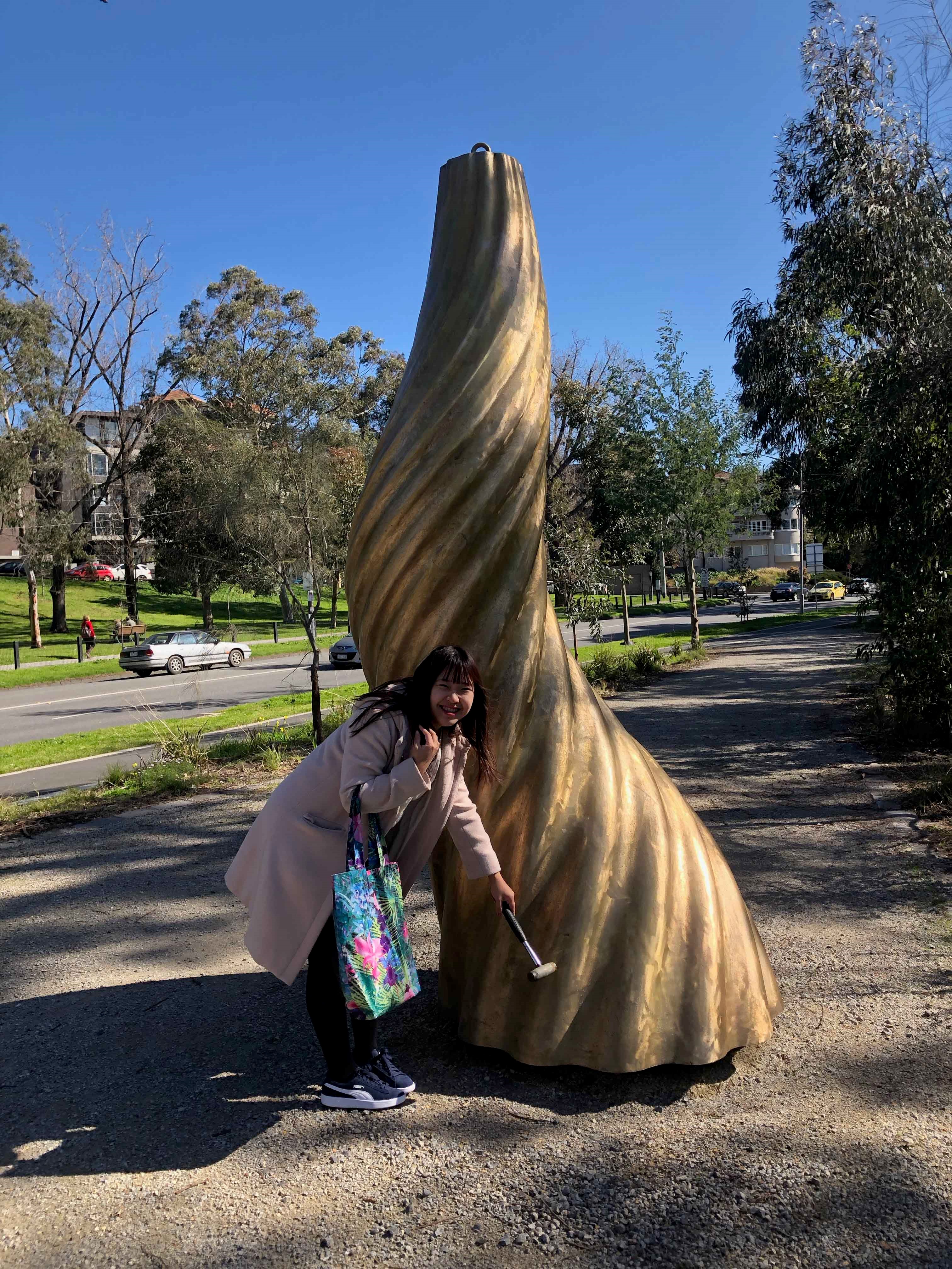2019 3m tall “twist bell” public art for the City of Stonnington. Cast bronze pitch D 74Hz