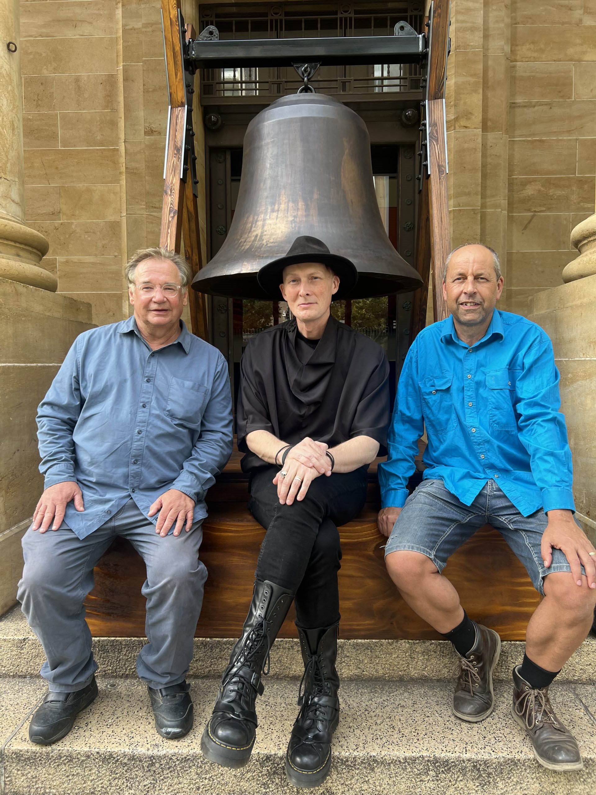 2024 Anton Hasell, (Australian bell) Lawrence English (artist) and Paul van de Loo (Applidyne) in front of the 700 kg European style bell designed by Australian Bell in collaboration with Applidyne in Adelaide. At the Gallery of SA as part of the Adelaide Arts Festival.